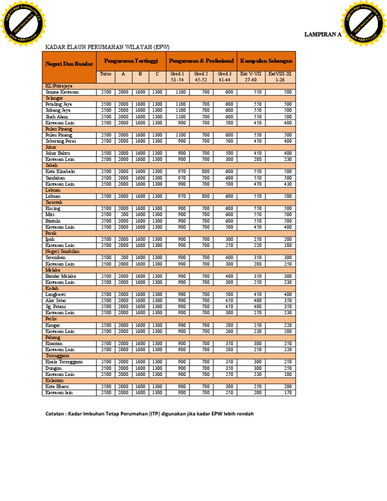 Related : Pekeliling Elaun Perumahan Wilayah / Kadar baharu elaun perumahan wilayah (epw) akan diumumkan dalam masa terdekat, menteri di jabatan perdana beliau berkata kadar elaun berkenaan tidak pernah disemak semula sejak 2002..