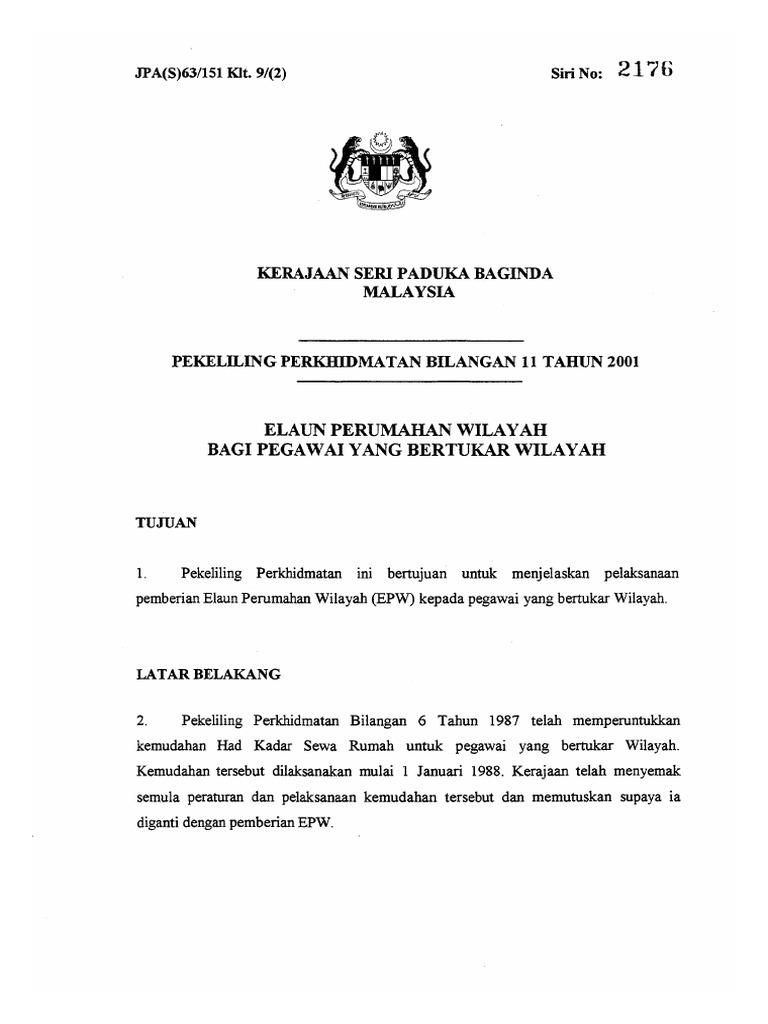 Pekeliling Elaun Perumahan Wilayah / Kadar baharu elaun perumahan wilayah (epw) akan diumumkan dalam masa terdekat, menteri di jabatan perdana beliau berkata kadar elaun berkenaan tidak pernah disemak semula sejak 2002.. Pindaan no.9 kepada pekeliling perbendaharaan bil.10 tahun 1994 dan bi.6 tahun 1995 bagi membenarkan penjawat awam memohon pinjaman perumahan pembelian hartanah di pasaran sekunder. Kadar baharu elaun perumahan wilayah (epw) akan diumumkan dalam masa terdekat, menteri di jabatan perdana beliau berkata kadar elaun berkenaan tidak pernah disemak semula sejak 2002. Pekeliling perkhidmatan ini bertujuan untuk 9. Maklumat di atas, pegawai adalah berasal daripada wilayah *semenanjung/ sabah (termasuk labuan). Dalam pada itu, beliau berkata semakan semula elaun tetap.